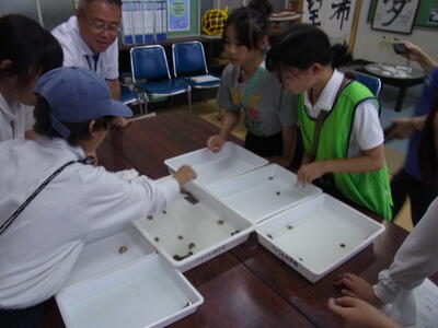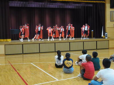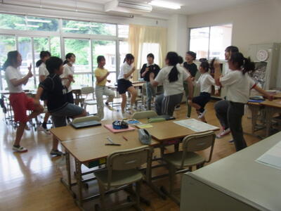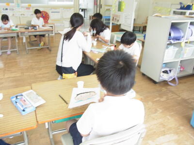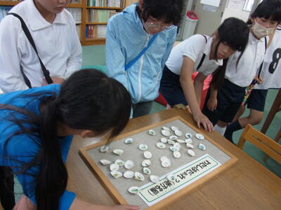 午後からは釣附海岸での活動の予定でしたが、あいにくの雨模様のため、室内プログラム「館内アドベンチャー」に変更しました。3校を8グループに分けた縦割り班で八つのポイントを回りグループで協力しながら課題を解決していきました。