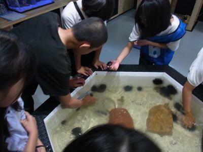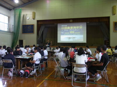 午前は、西原館長さんによる海辺のガイダンスを受けました。自然科学の観点からの江田島の海について地形の特徴や生き物の生態の変化などを学びました。