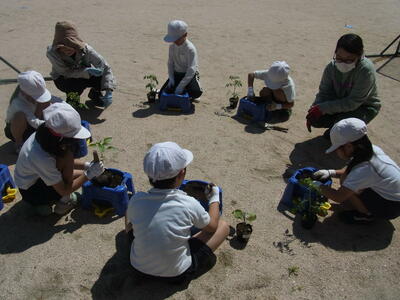 2年生は、生活科の学習でJAひろしまの職員の方々にお越しいただき、野菜(ミニトマト、ピーマン、ナスなど)の苗を一人一人自分の植木鉢に植え替えていきました。