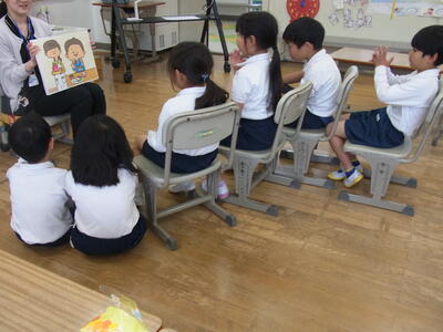 2年生は養護教諭による食育の授業で、食べ物にどんな栄養があるのか紙芝居やキャラクターを
