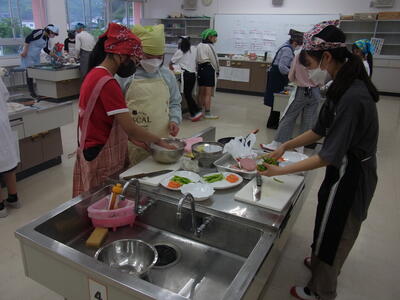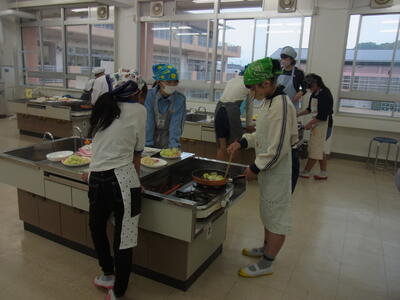 5・6年生は、家庭科の調理実習で野菜炒めを作りました。