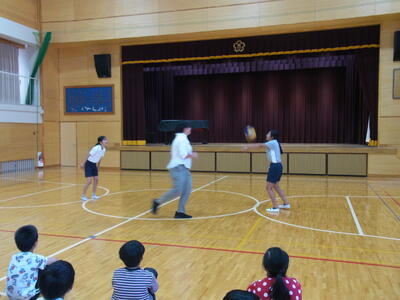はじめはサーブなどを披露し、最後は教員も入って3人で連続パス100回を目指してパスをつないでいきました。