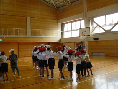 はじめに、運動会で披露する「ジェンカ」のステップの練習をしました。簡単なステップなのでみんなすぐに覚えて音楽に合わせて楽しく踊りました。