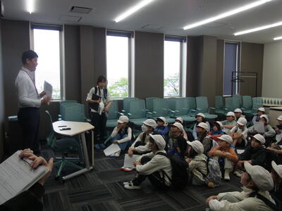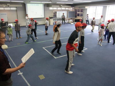 あいにくの雨天のため荒代海岸での海辺の学習はできませんでしたが、代わりに青少年の交流の家でさとうみ科学館のみなさんによるカブトガニの成長が学べる鬼ごっこを楽しみました。