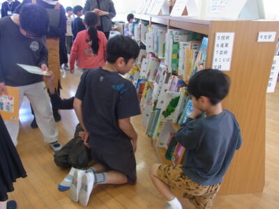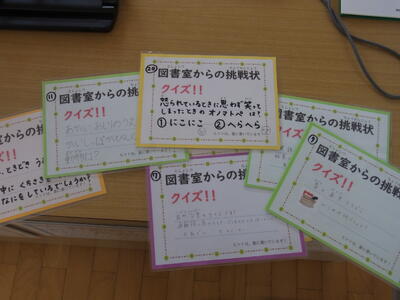 入り口の表示 6年生が作った図書館クイズに挑戦!