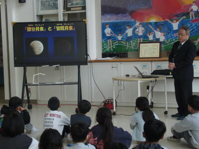 さとうみ科学館の西原館長様から、皆既月食や月と地球の距離、地球・月・太陽の大きさの関係など